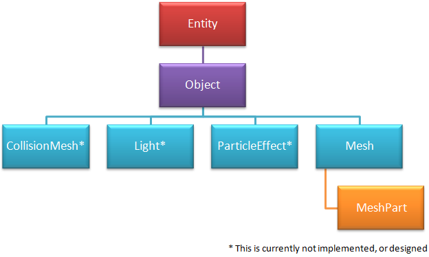 An Object is somewhat the Type definition for an Entity. When an object is changed, all entities that refer to this object also change. An object can contain a number of render elements, a number of collision meshes, and other things like maybe contact points, lights, …